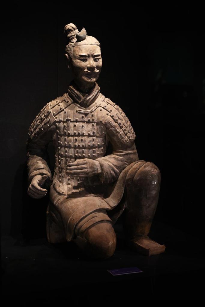 A terracotta warrior is displayed at the Qin Han Museum of the Shaanxi History Museum in Xi'an, capital of northwest China's Shaanxi Province, April 15, 2024. (Xinhua/Li Yibo)
