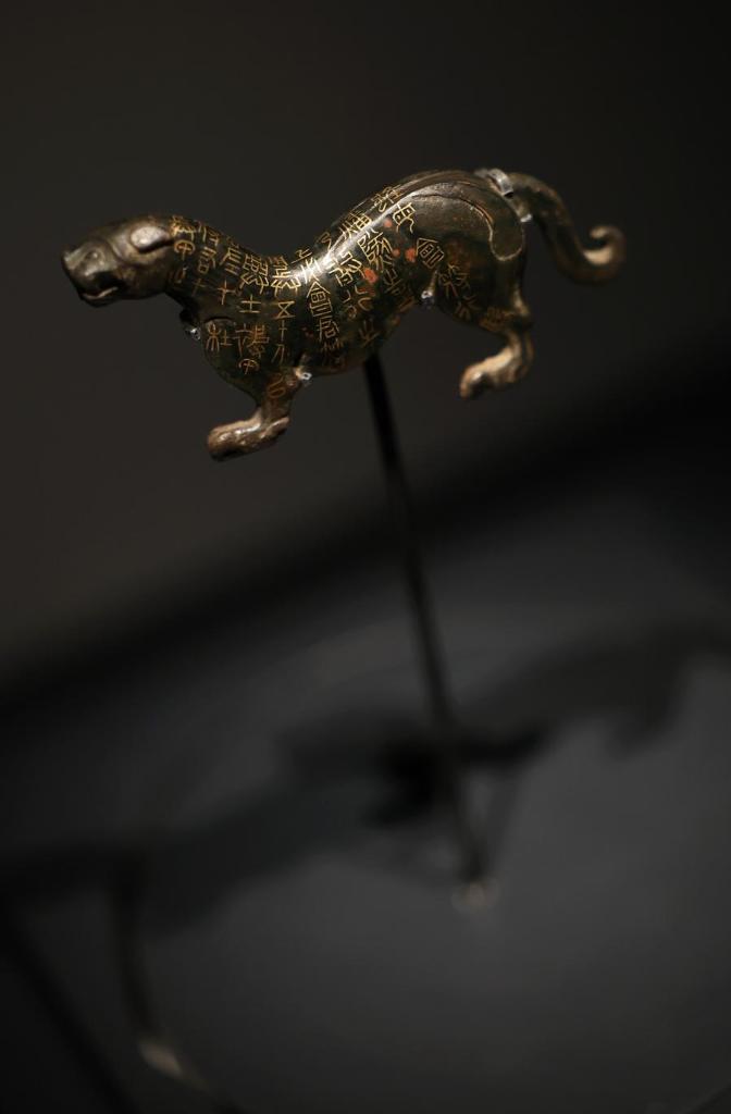 A tiger-shaped figurine is displayed at the Qin Han Museum of the Shaanxi History Museum in Xi'an, capital of northwest China's Shaanxi Province, April 15, 2024. (Xinhua/Li Yibo)