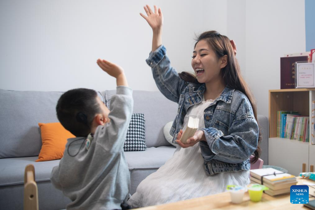 Li Hongjia gives a training session to a hearing-impaired child at the Little Sunflower rehabilitation center in Jiangxia District of Wuhan, central China's Hubei Province, April 20, 2024.(Xinhua/Du Zixuan)