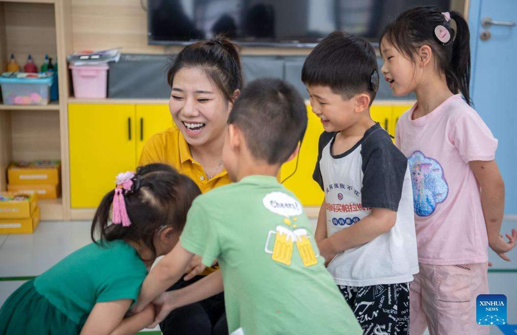 Li Hongjia gives a training session to hearing-impaired children at the Little Sunflower rehabilitation center in Jiangxia District of Wuhan, central China's Hubei Province, May 17, 2024. (Xinhua/Du Zixuan)