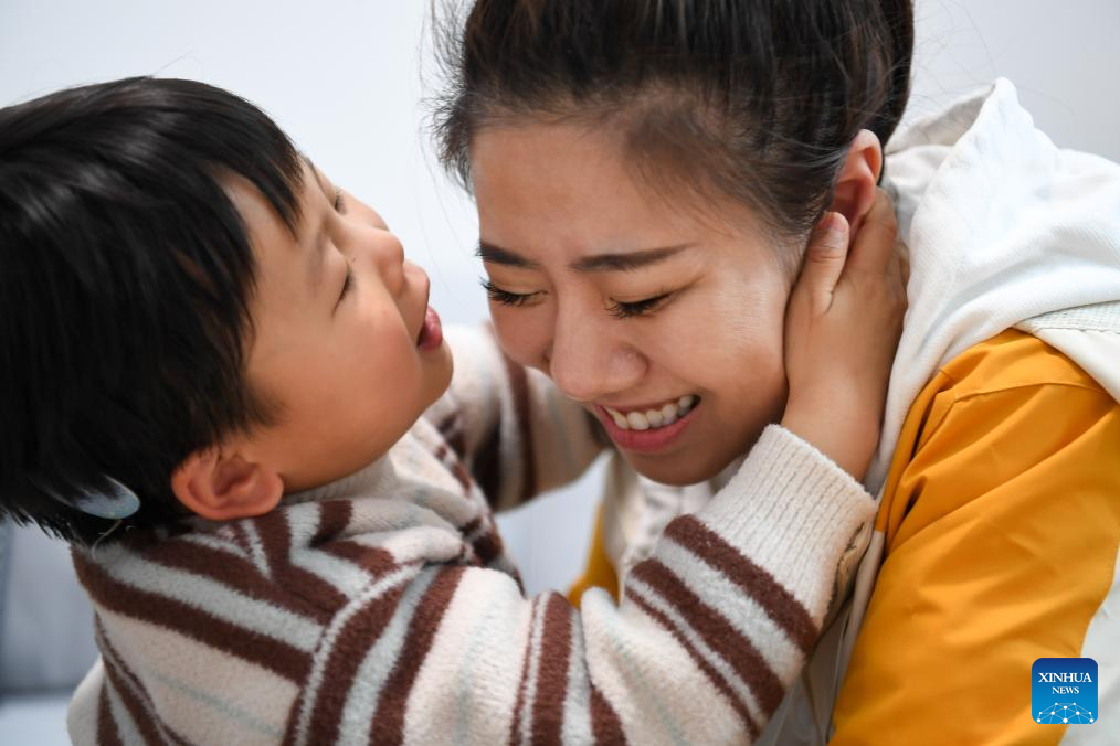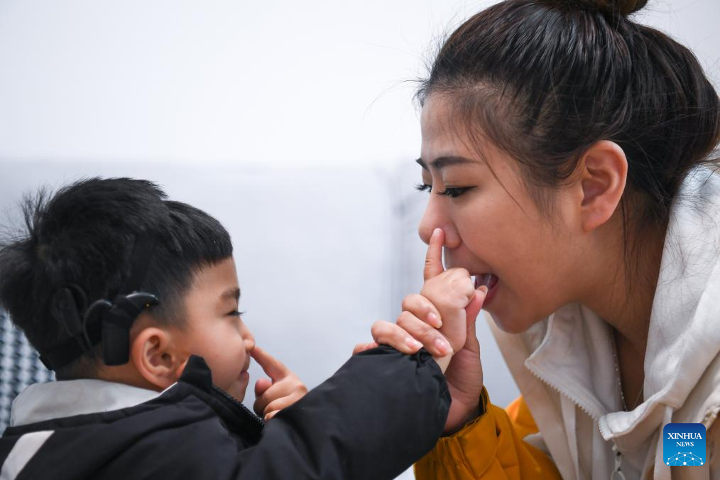 Li Hongjia gives a training session to a hearing-impaired child at the Little Sunflower rehabilitation center in Jiangxia District of Wuhan, central China's Hubei Province, March 27, 2024.(Xinhua/Du Zixuan)