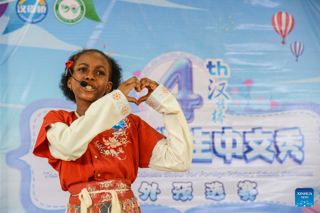 A contestant competes in the Cameroon Finals of the 4th "Chinese Bridge" Chinese Show Competition for foreign primary school students in Soa, Cameroon, May 18, 2024. The competition was held on Saturday in the Confucius Institute at University of Yaounde II in Soa, Cameroon, with 12 primary school students participated in the event. (Photo by Kepseu/Xinhua)