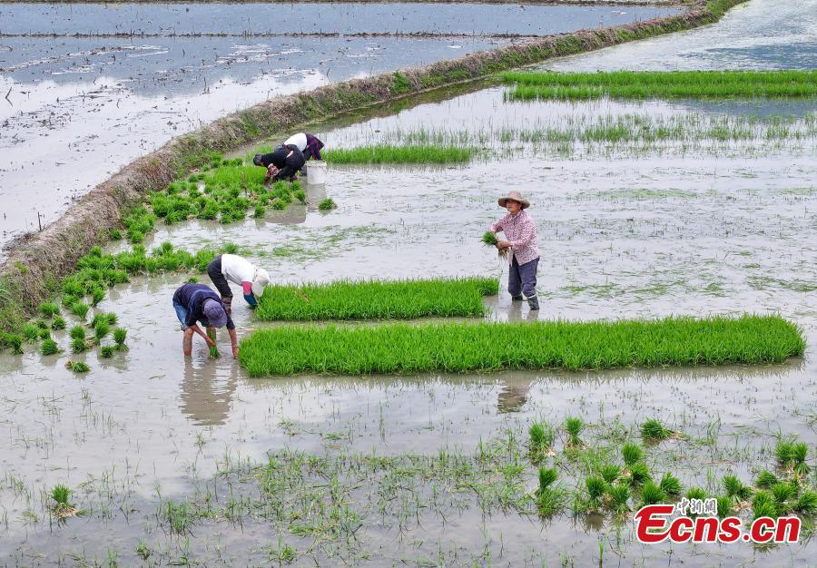 Villagers work on a rice field ahead of the traditional Chinese solar term Xiaoman (grain buds) which falls on May 20 this year. (Photo: China News Service/Shi Yalei)