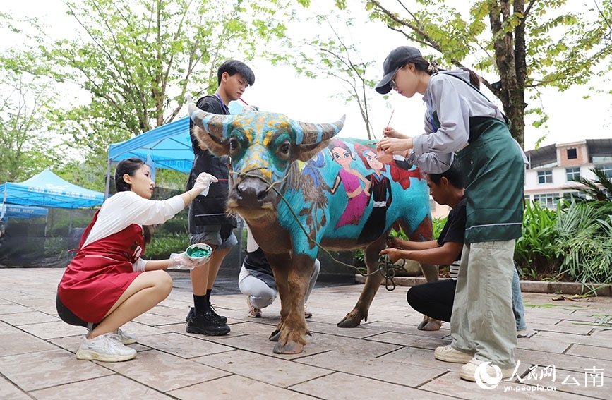 People paint on a buffalo's body. (People's Daily Online/Hu Zunhui)