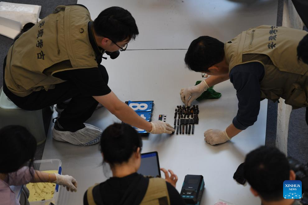 Archaeologists inventory the relics unearthed from the Wuwangdun tomb discovered in Huainan, east China's Anhui Province, May 20, 2024. (Xinhua/Zhang Duan)