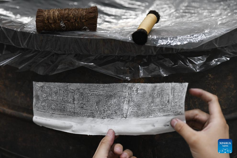 An archaeologist observes a relic unearthed from the Wuwangdun tomb discovered in Huainan, east China's Anhui Province, May 20, 2024. (Xinhua/Zhang Duan)