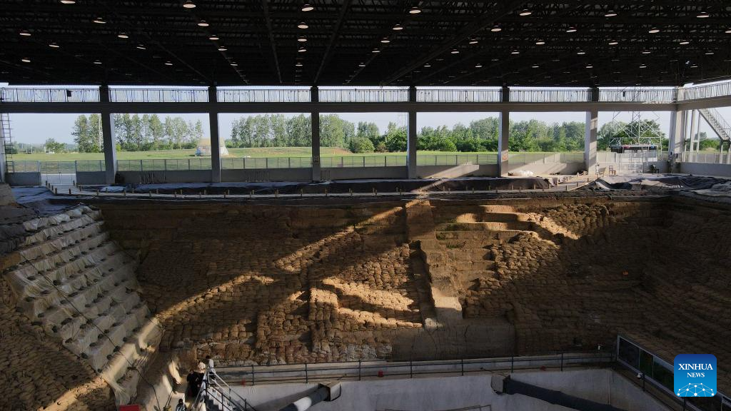 An aerial drone photo taken on May 20, 2024 shows the excavation site of the Wuwangdun tomb discovered in Huainan, east China's Anhui Province. (Xinhua/Zhang Duan)