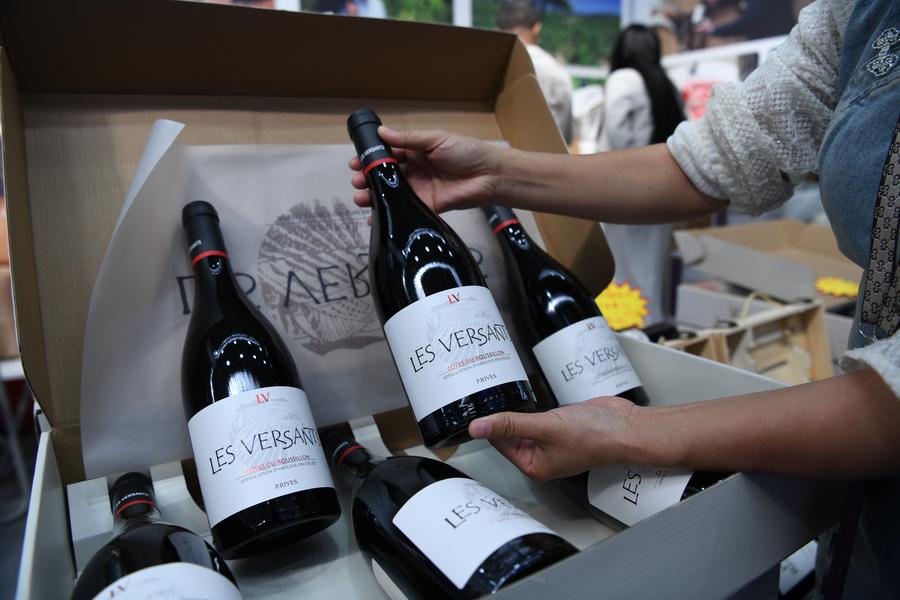 An exhibitor shows wines from France during the eighth China-Russia Expo in Harbin, northeast China's Heilongjiang Province, May 20, 2024. (Xinhua/Wang Song)
