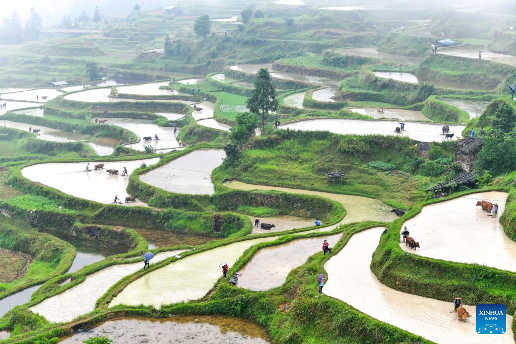 Farmers and farm cattle work in terraced fields during an event presenting the local agricultural traditions in Liping County, southwest China's Guizhou Province, May 18, 2024. (Xinhua/Yang Wenbin)