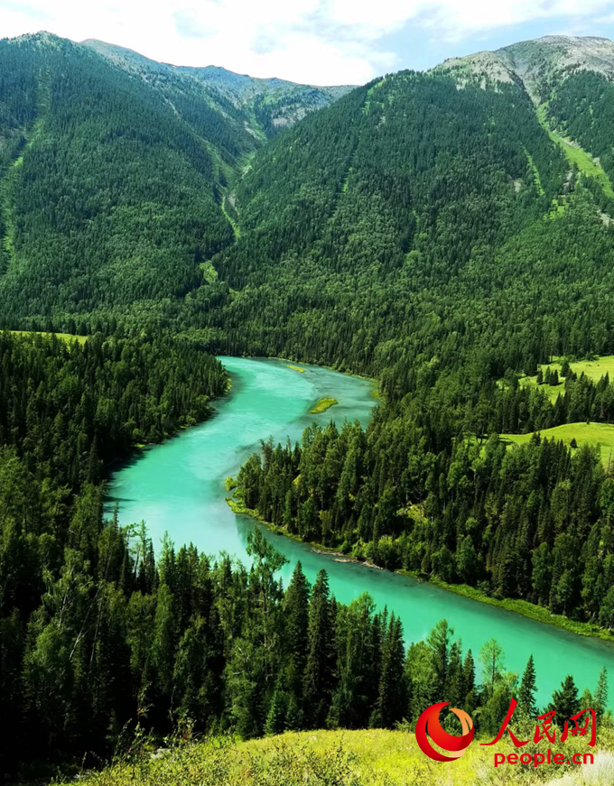 Photo shows the Moon Bay in Kanas scenic area in Altay Prefecture, northwest China’s Xinjiang Uygur Autonomous Region. The Kanas Lake flows through here, creating a moon-shaped bay. It meanders through the lush valley, and the color of the water changes with the seasons. (People’s Daily Online/Han Ting)
