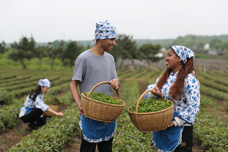International students from the Shandong University of Science and Technology pick tea leaves in Qingdao, east China's Shandong Province. (Photo/CFP)