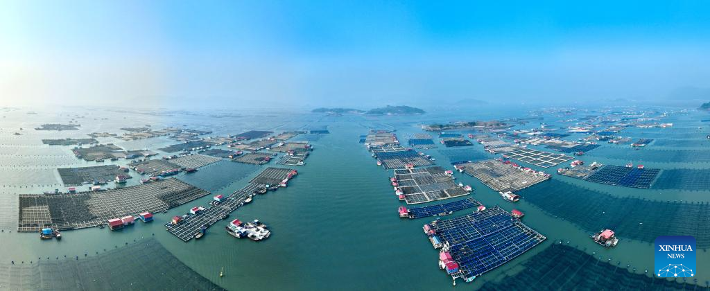 An aerial panoramic drone photo taken on Jan. 11, 2024 shows a mariculture zone in Xiapu County, southeast China's Fujian Province. (Xinhua/Jiang Kehong)