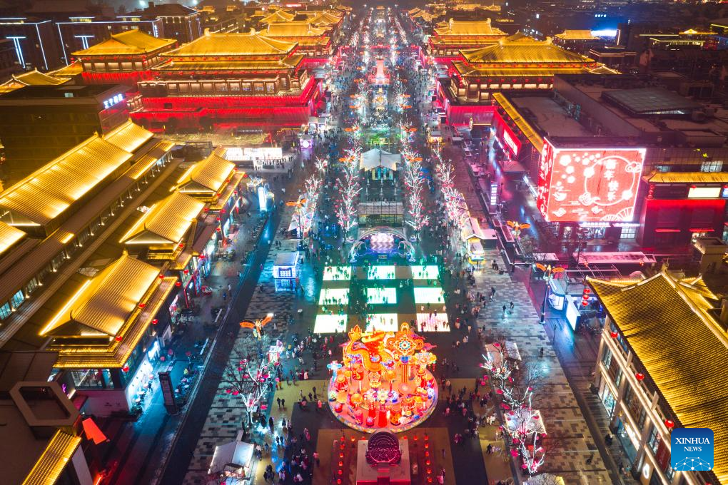 An aerial drone photo taken on Feb. 2, 2024 shows a view of the Great Tang All Day Mall in Xi'an, capital of northwest China's Shaanxi Province. Xi'an, one of the ancient capitals in Chinese history, attracts a growing number of tourists in recent years. (Xinhua/Shao Rui)