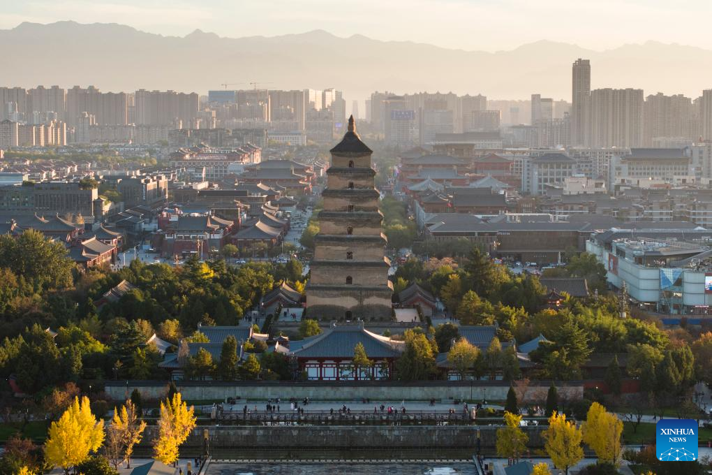 An aerial drone photo taken on Nov. 17, 2023 shows a view of the Giant Wild Goose Pagoda in Xi'an, northwest China's Shaanxi Province. Xi'an, one of the ancient capitals in Chinese history, attracts a growing number of tourists in recent years. (Xinhua/Shao Rui)