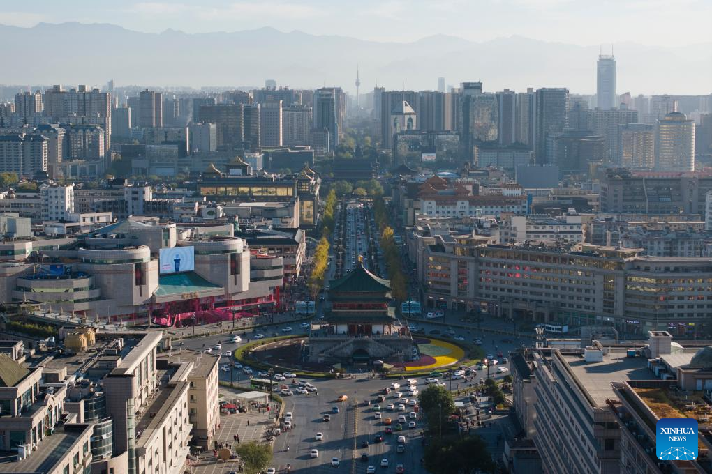 An aerial drone photo taken on Nov. 17, 2023 shows the Bell Tower and a city view in Xi'an, northwest China's Shaanxi Province. Xi'an, one of the ancient capitals in Chinese history, attracts a growing number of tourists in recent years. (Xinhua/Shao Rui)