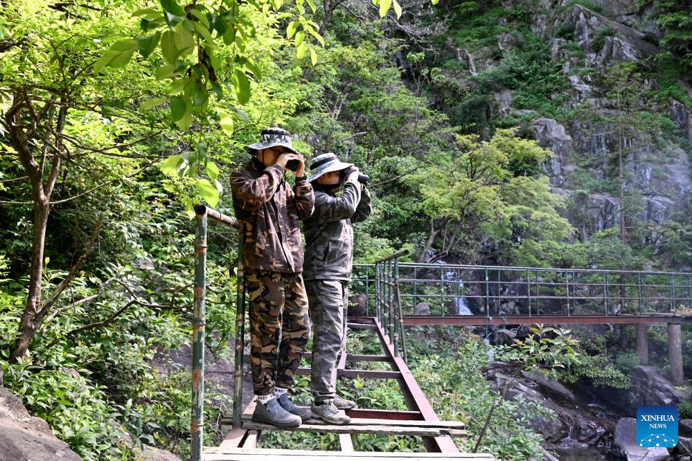 Zhang Tong (L) and Gao Xin, members of Anhui University primate research team, observe Huangshan stump-tailed macaques in Fuxi Village of Tangkou Township in Huangshan, east China's Anhui Province, May 15, 2024. (Xinhua/Huang Bohan)