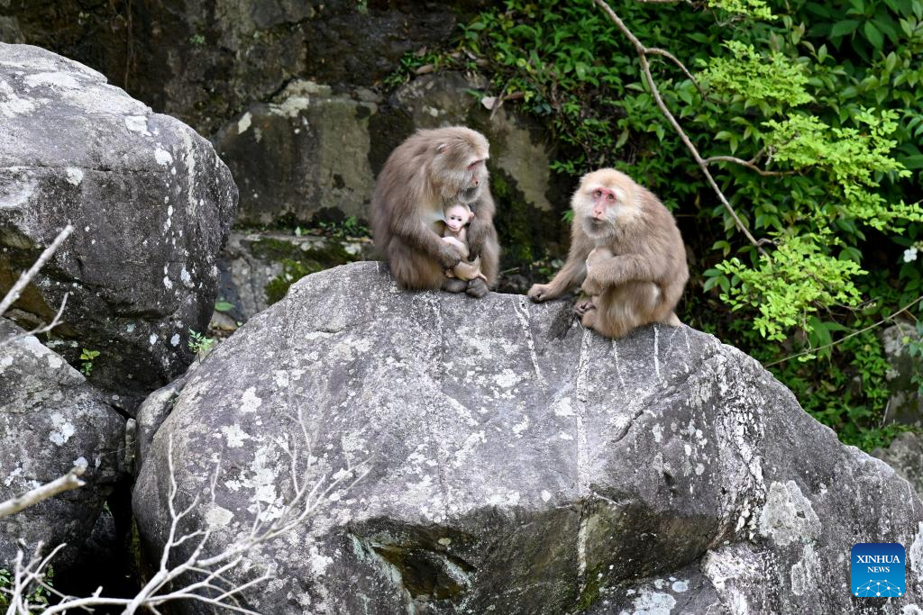 Huangshan stump-tailed macaques are pictured in Fuxi Village of Tangkou Township in Huangshan, east China's Anhui Province, May 15, 2024. (Xinhua/Huang Bohan)