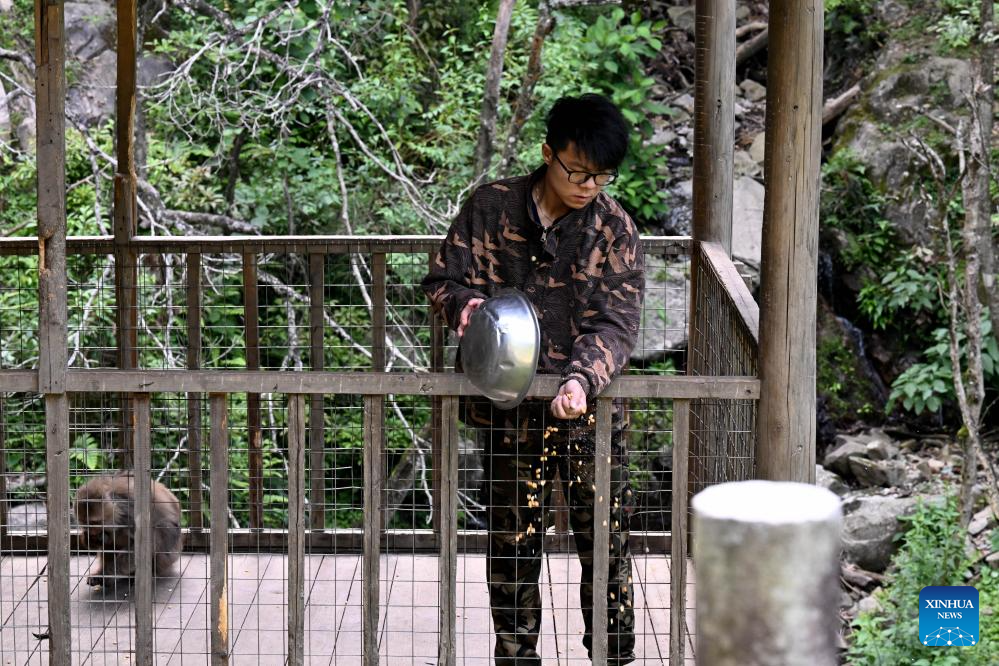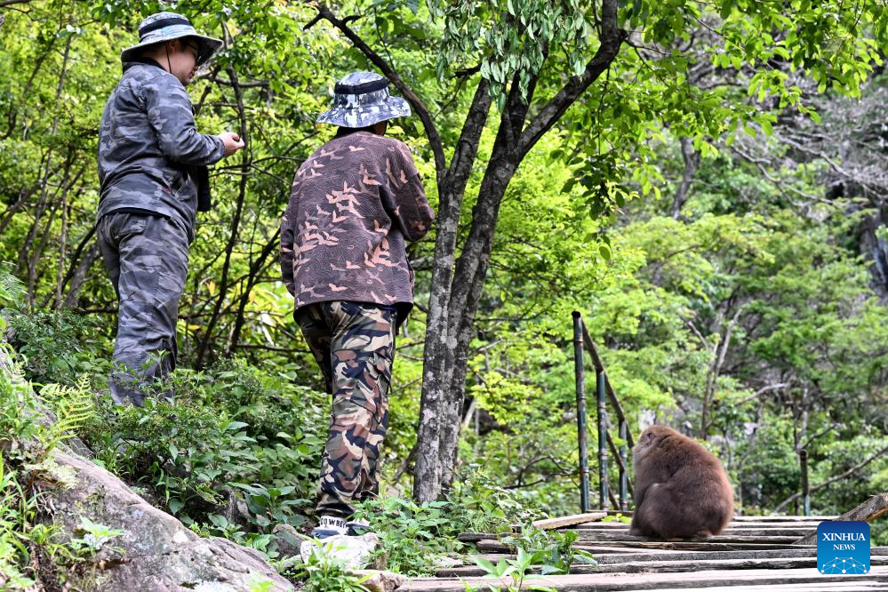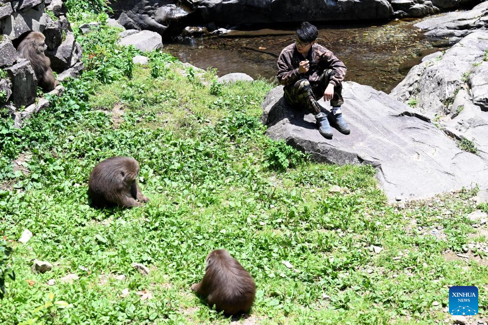 Zhang Tong, a doctoral candidate of Anhui University primate research team, attracts Huangshan stump-tailed macaques with food in Fuxi Village of Tangkou Township in Huangshan, east China's Anhui Province, May 15, 2024. (Xinhua/Huang Bohan)