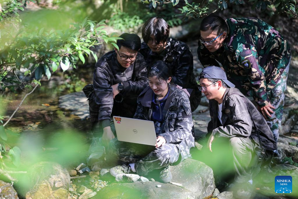 Members of Anhui University primate research team conduct ecological study in Fuxi Village of Tangkou Township in Huangshan, east China's Anhui Province, Aug. 11, 2023. (Photo by Fan Chengzhu/Xinhua)