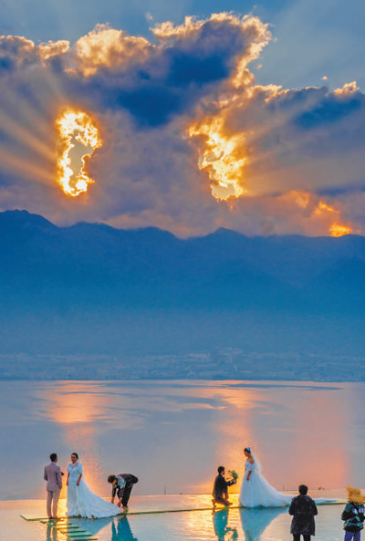 People pose for wedding photos at Erhai Lake in Dali, southwest China's Yunnan Province. (Photo/Zhao Yu)