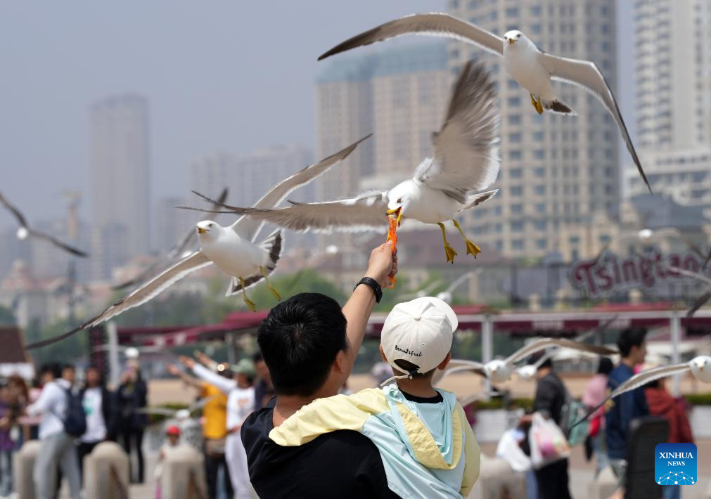 A tourist feeds a seagull at Xinghai Square in Dalian, northeast China's Liaoning Province, May 22, 2024. Various scenic spots in Dalian see surging tourists as the coastal city reaches the peak of its tourism season. The sites as zoos and aquariums even the natural places where tourists can see wild animals are among the increasingly popular destinations for the tourists. (Xinhua/Zhang Lei)