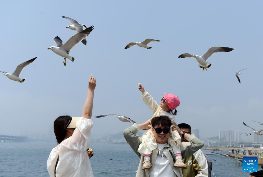 Tourists have fun at Xinghai Square in Dalian, northeast China's Liaoning Province, May 22, 2024. Various scenic spots in Dalian see surging tourists as the coastal city reaches the peak of its tourism season. The sites as zoos and aquariums even the natural places where tourists can see wild animals are among the increasingly popular destinations for the tourists. (Xinhua/Liu Yun)