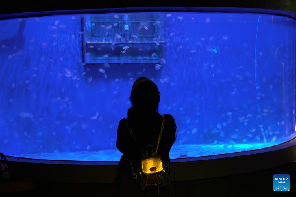 A tourist views jellyfish at Sunasia Ocean World in Dalian, northeast China's Liaoning Province, May 22, 2024. Various scenic spots in Dalian see surging tourists as the coastal city reaches the peak of its tourism season. The sites as zoos and aquariums even the natural places where tourists can see wild animals are among the increasingly popular destinations for the tourists. (Xinhua/Li Xiao)