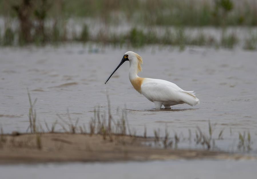 A black-faced spoonbill forages at the Minjiang River estuary wetland in Fuzhou, southeast China's Fujian Province, March 26, 2024. (Xinhua/Wei Peiquan)
