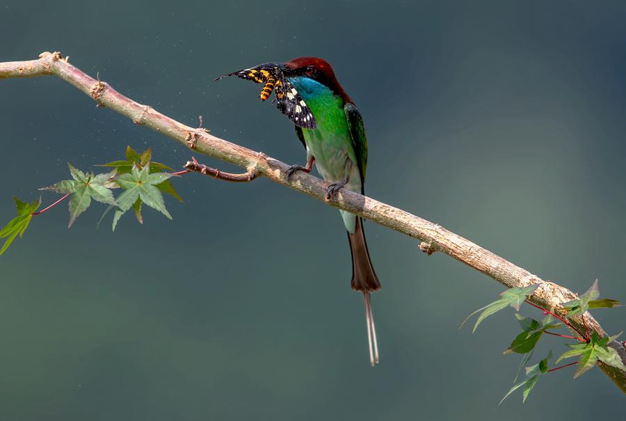 A blue-throated bee eater catches a butterfly at the bank of Minjiang River in Nanping, southeast China's Fujian Province, May 10, 2024.(Xinhua/Wei Peiquan)