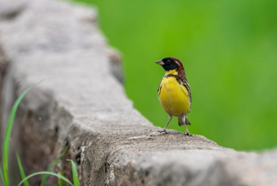 A yellow-breasted bunting forages near a paddy field in Fuzhou, southeast China's Fujian Province, April 24, 2024. (Xinhua/Wei Peiquan)