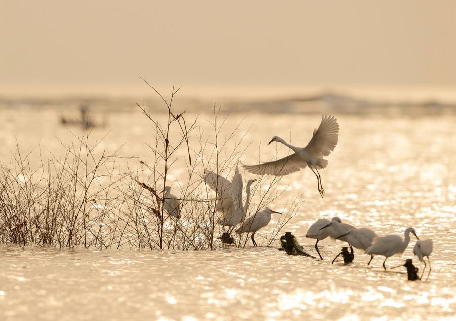 Herons forage at the Minjiang River estuary wetland in Fuzhou, southeast China's Fujian Province, Dec. 2, 2023. (Xinhua/Wei Peiquan)