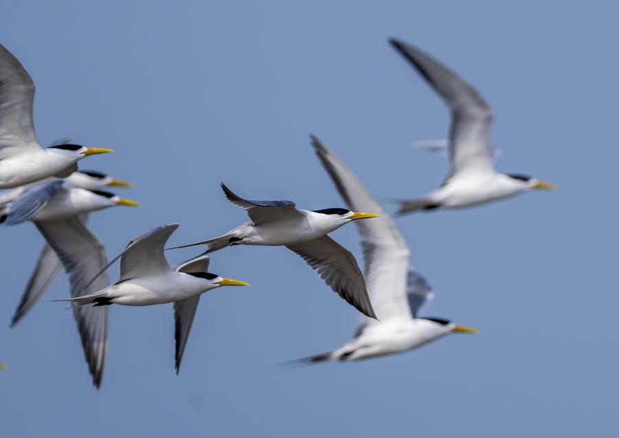 Greater crested terns fly over the Minjiang River estuary wetland in Fuzhou, southeast China's Fujian Province, April 29, 2024. (Xinhua/Wei Peiquan)