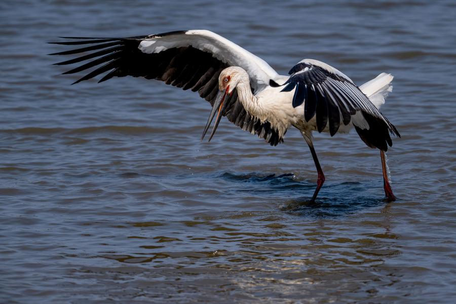 An oriental white stork forages at the Minjiang River estuary wetland in Fuzhou, southeast China's Fujian Province, Nov. 27, 2023. (Xinhua/Wei Peiquan)
