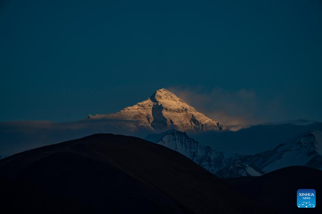 This photo taken on May 21, 2024 from the Mount Qomolangma base camp in Tingri County of Xigaze City in southwest China's Xizang Autonomous Region shows a view of Mount Qomolangma at sunset. (Xinhua/Ding Ting)