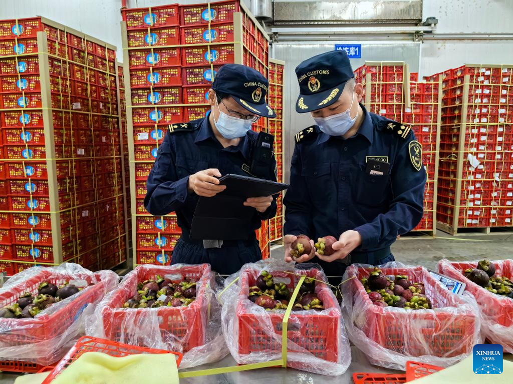 Officers of Qinzhou Port Customs check imported mangosteens at the Qinzhou Port in Qinzhou city, south China's Guangxi Zhuang Autonomous Region, March 25, 2024. (Xinhua/Li Fuyang)
