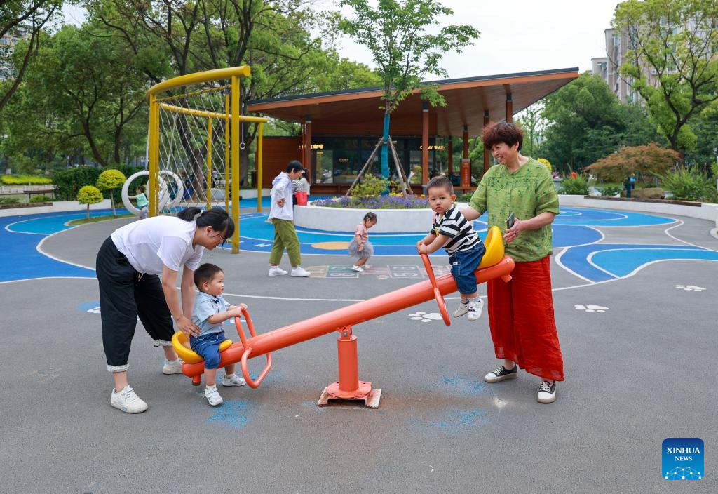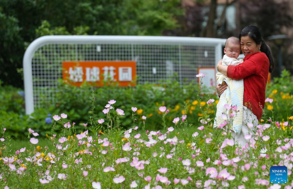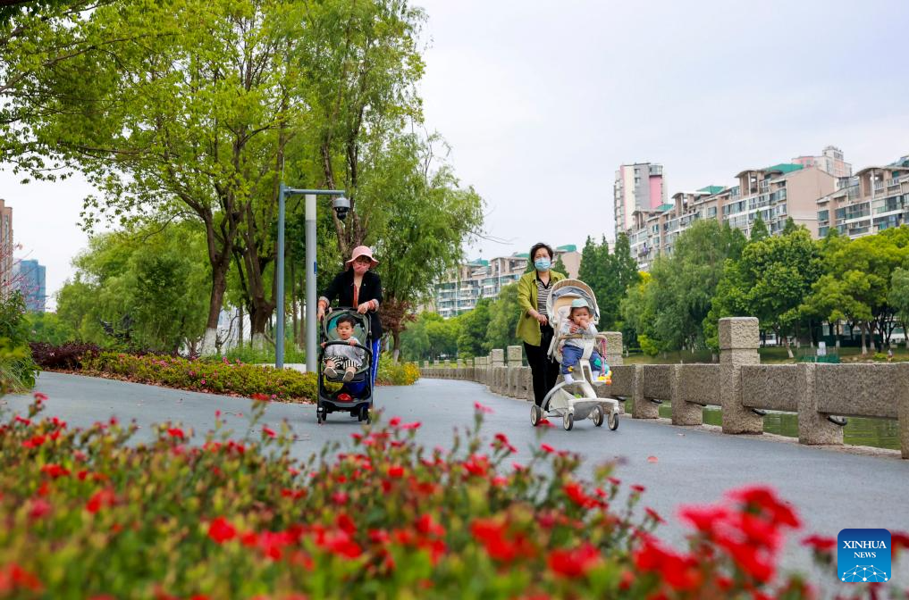 People walk with baby strollers at a scenic belt along the Liangxi River in Wuxi, east China's Jiangsu Province, May 22, 2024. Wuxi city is building a scenic belt along the Liangxi River in recent years to provide its local people with leisure space. (Photo by Gu Jihong/Xinhua)