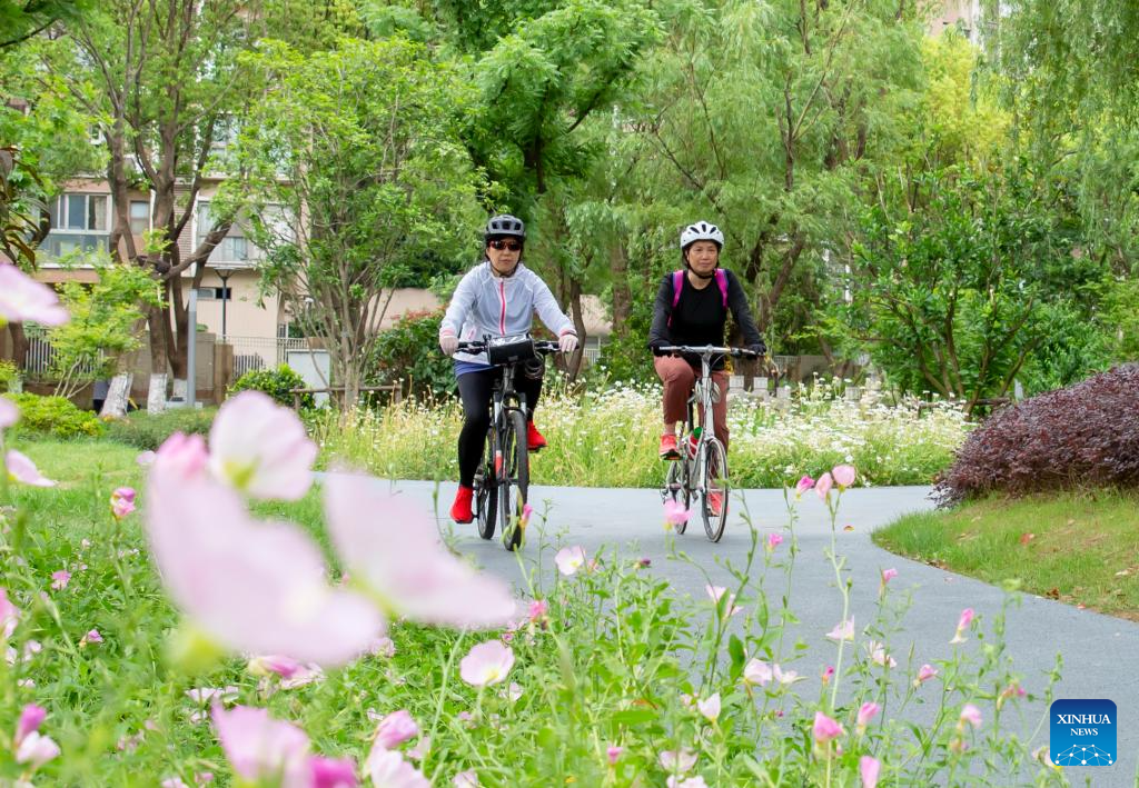Citizens ride bikes at a scenic belt along the Liangxi River in Wuxi, east China's Jiangsu Province, May 22, 2024. Wuxi city is building a scenic belt along the Liangxi River in recent years to provide its local people with leisure space. (Photo by Xiang Zhonglin/Xinhua)