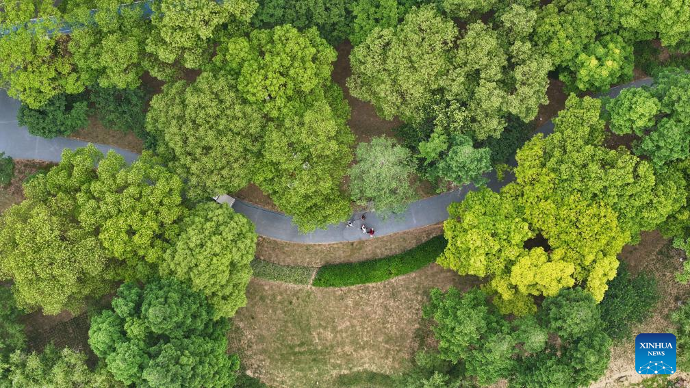An aerial drone photo taken on May 22, 2024 shows people walking at a scenic belt along the Liangxi River in Wuxi, east China's Jiangsu Province. Wuxi city is building a scenic belt along the Liangxi River in recent years to provide its local people with leisure space. (Photo by Yin Chao/Xinhua)