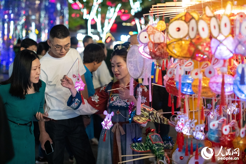 As night falls, Datang Everbright City, a tourist landmark featuring a grand street with characteristics of the Tang Dynasty (618-907), lights up with colorful lanterns. Tourists dressed in Hanfu, the traditional attire of the Han ethnic group, and Tang Dynasty-style costumes pose for photos.