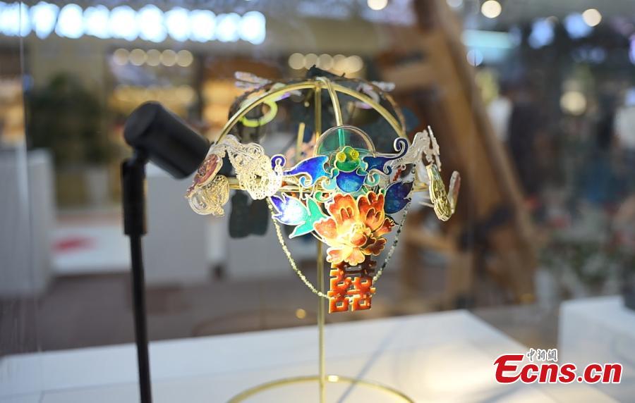 A ceramic headwear is displayed at an exhibition in Jingdezhen, east China's Jiangxi Province. (Photo: China News Service/Li Jie)