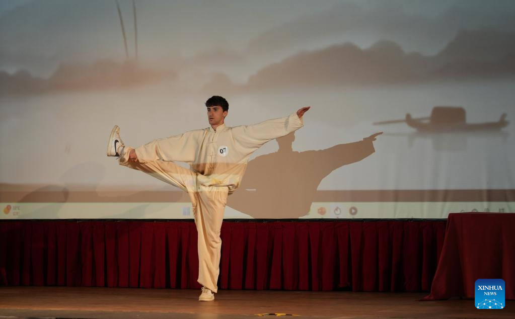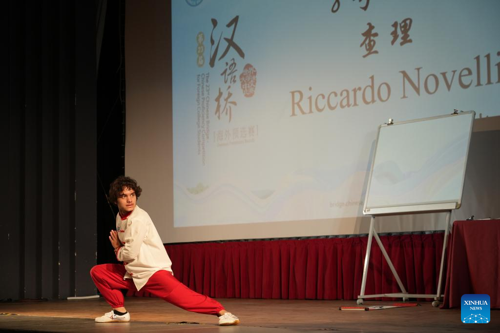 A contestant shows his talent during the 23rd Chinese Bridge-Chinese Proficiency Competition for Foreign College Students' Italy-San Marino competition in the city of Macerata, Italy, May 24, 2024. A Chinese language competition was held in Italy this week in the city of Macerata, with students from eight colleges across the country showcasing their written and oral skills over two days of activities. (Xinhua/Ren Yaoting)