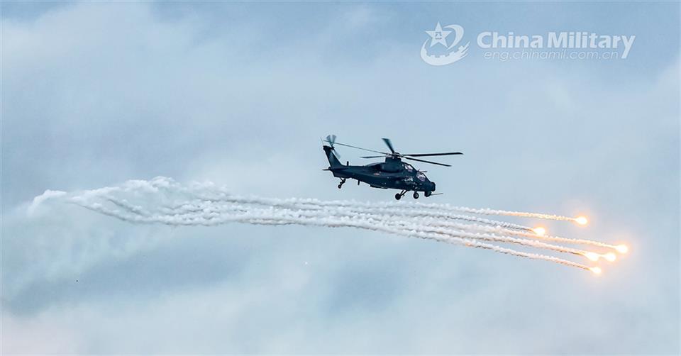 A helicopter attached to a brigade under the PLA 73rd Group Army fires off the decoy flares during a joint assault training exercise held on May 11, 2024. (eng.chinamil.com.cn/Photo by Shi Zhipeng)