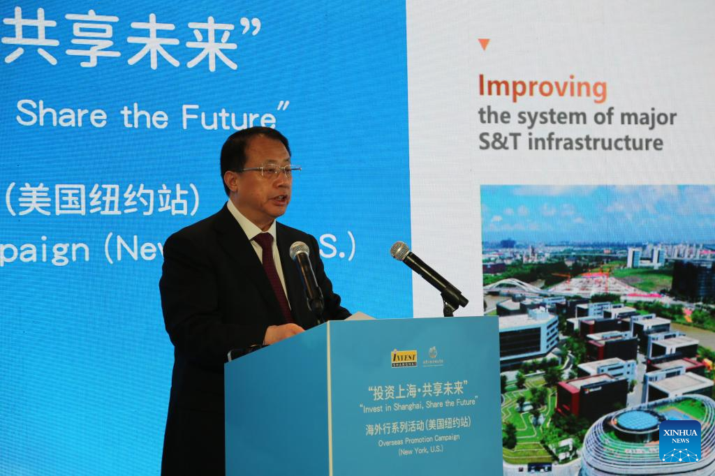 Shanghai Mayor Gong Zheng delivers a keynote speech at a promotion event in New York, the United States, on May 23, 2024. China's business hub Shanghai held a promotional event here Thursday, which drew great attention and interest from investors in the United States.