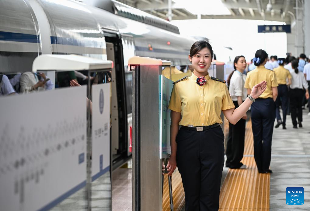 A staff member welcomes passengers for intercity railway at Machong Station in Dongguan, south China's Guangdong Province, May 26, 2024. Intercity railways from Guangzhou to Foshan and from Foshan to Dongguan were officially put into operation on Sunday. The two newly opened intercity railways are connected with the already opened ones from Foshan to Zhaoqing and from Dongguan to Huizhou, forming a 258-kilometer railway line linking the five cities from east to west in Guangdong. The railway is the longest intercity railway in the Guangdong-Hong Kong-Macao Greater Bay Area, and is of great significance in accelerating the formation of a one-hour life circle in the area. (Xinhua/Liu Dawei)