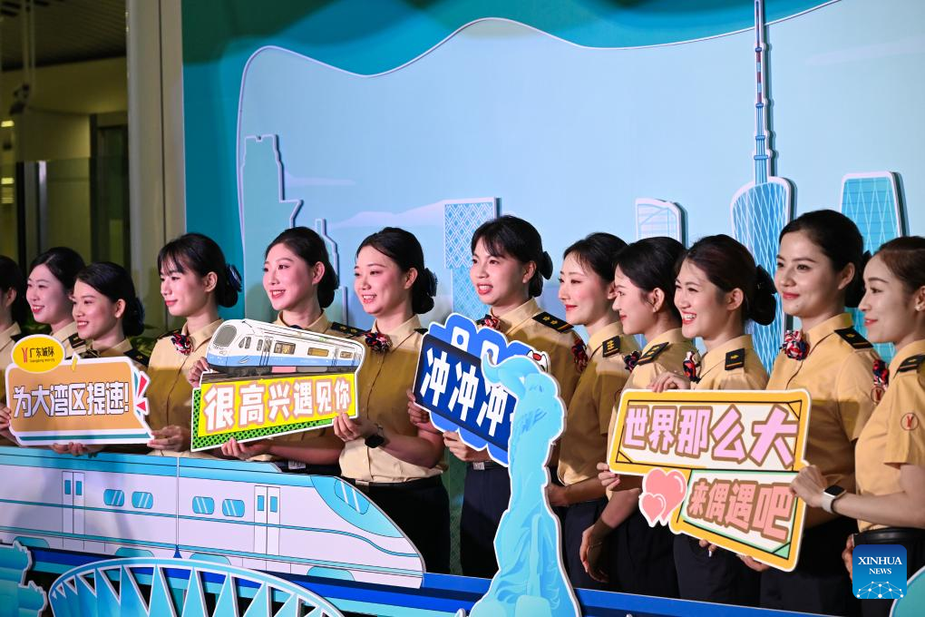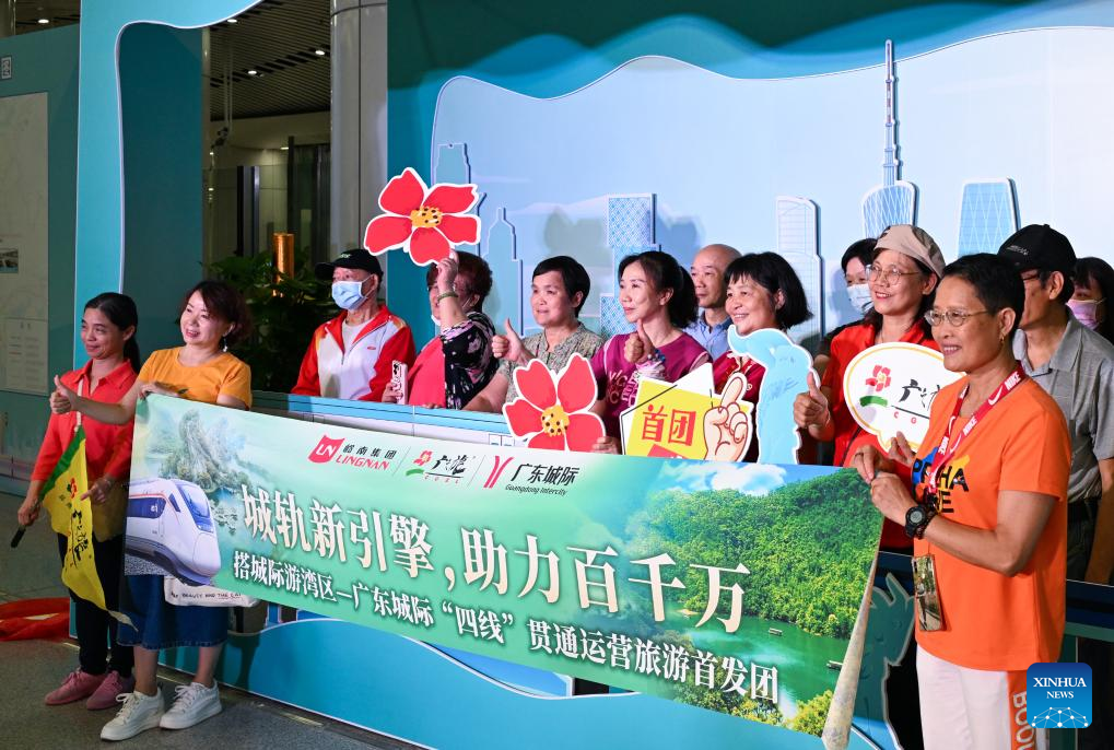 A group of tourists pose for photos at a ceremony marking the connection of four intercity railways linking cities of Zhaoqing, Foshan, Guangzhou, Dongguan and Huizhou at the Panyu Station in Guangzhou, south China's Guangdong Province, May 26, 2024. Intercity railways from Guangzhou to Foshan and from Foshan to Dongguan were officially put into operation on Sunday. The two newly opened intercity railways are connected with the already opened ones from Foshan to Zhaoqing and from Dongguan to Huizhou, forming a 258-kilometer railway line linking the five cities from east to west in Guangdong. The railway is the longest intercity railway in the Guangdong-Hong Kong-Macao Greater Bay Area, and is of great significance in accelerating the formation of a one-hour life circle in the area. (Xinhua/Liu Dawei)