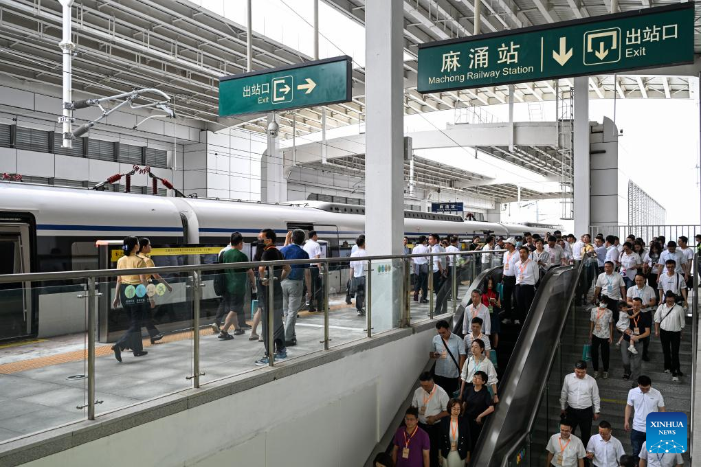 The first train of the intercity railway from Foshan to Dongguan is seen at Machong Station in Dongguan, south China's Guangdong Province, May 26, 2024. Intercity railways from Guangzhou to Foshan and from Foshan to Dongguan were officially put into operation on Sunday. The two newly opened intercity railways are connected with the already opened ones from Foshan to Zhaoqing and from Dongguan to Huizhou, forming a 258-kilometer railway line linking the five cities from east to west in Guangdong. The railway is the longest intercity railway in the Guangdong-Hong Kong-Macao Greater Bay Area, and is of great significance in accelerating the formation of a one-hour life circle in the area. (Xinhua/Liu Dawei)