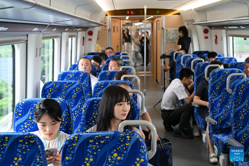 Passengers are seen on the first train of the intercity railway from Foshan to Dongguan in south China's Guangdong Province, May 26, 2024. Intercity railways from Guangzhou to Foshan and from Foshan to Dongguan were officially put into operation on Sunday. The two newly opened intercity railways are connected with the already opened ones from Foshan to Zhaoqing and from Dongguan to Huizhou, forming a 258-kilometer railway line linking the five cities from east to west in Guangdong. The railway is the longest intercity railway in the Guangdong-Hong Kong-Macao Greater Bay Area, and is of great significance in accelerating the formation of a one-hour life circle in the area. (Xinhua/Liu Dawei)
