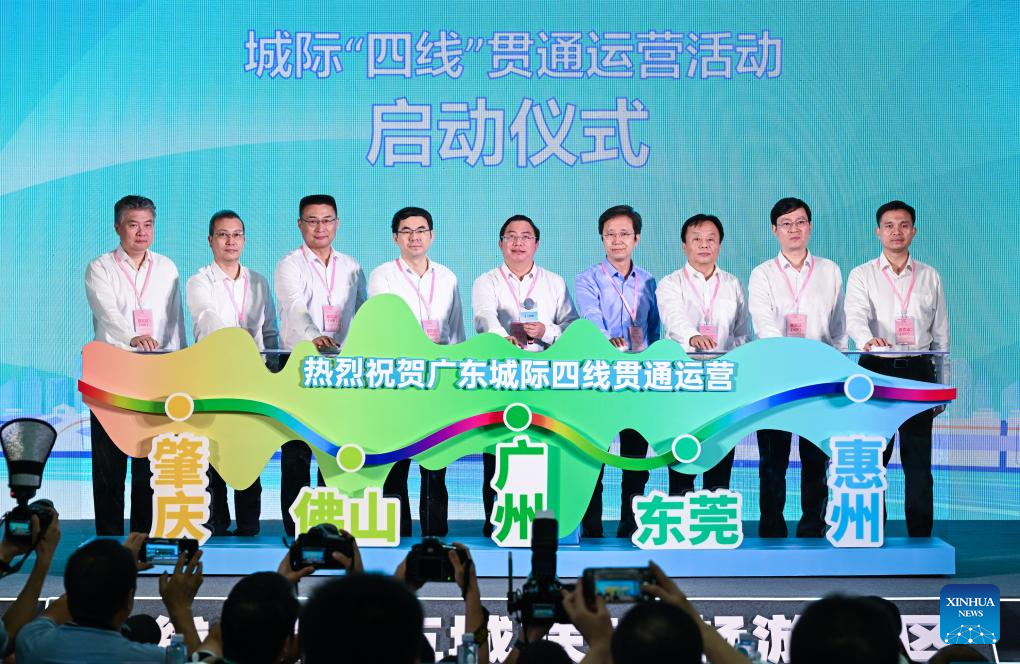 A ceremony marking the connection of four intercity railways linking cities of Zhaoqing, Foshan, Guangzhou, Dongguan and Huizhou is held at the Panyu Station in Guangzhou, south China's Guangdong Province, May 26, 2024. Intercity railways from Guangzhou to Foshan and from Foshan to Dongguan were officially put into operation on Sunday. The two newly opened intercity railways are connected with the already opened ones from Foshan to Zhaoqing and from Dongguan to Huizhou, forming a 258-kilometer railway line linking the five cities from east to west in Guangdong. The railway is the longest intercity railway in the Guangdong-Hong Kong-Macao Greater Bay Area, and is of great significance in accelerating the formation of a one-hour life circle in the area. (Xinhua/Liu Dawei)
