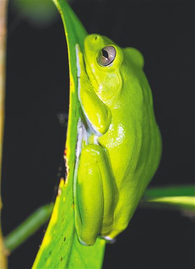 Photo shows a tree frog in the Wuzhishan section of the Hainan Tropical Rainforest National Park in south China's Hainan Province. (Hainan Daily/Li Tianping)