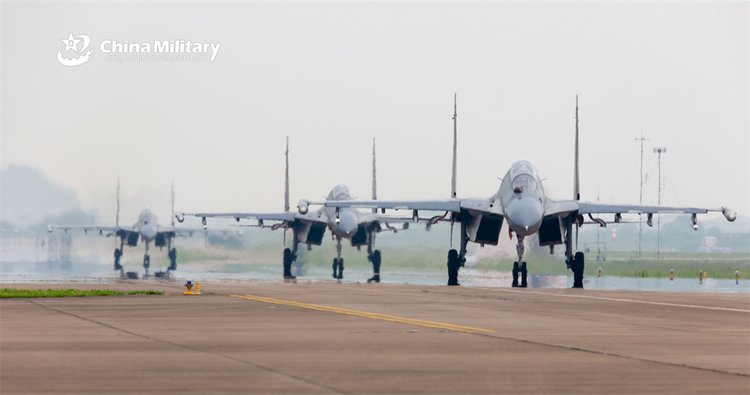 Fighter jets attached to an aviation brigade with the air force under the PLA Eastern Theater Command taxi in close formation on the runway before takeoff during a flight training exercise on May 8, 2024. (eng.chinamil.com.cn/Photo by Huang Guotai)